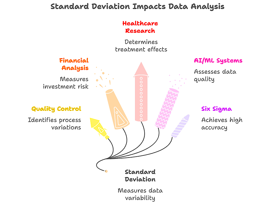 In quality management, the standard deviation helps identify process variations before they become costly defects. Financial analysts use it to measure investment risk; a stock with a high standard deviation is more volatile and potentially riskier. Healthcare researchers rely on it to determine whether treatment effects are statistically meaningful.